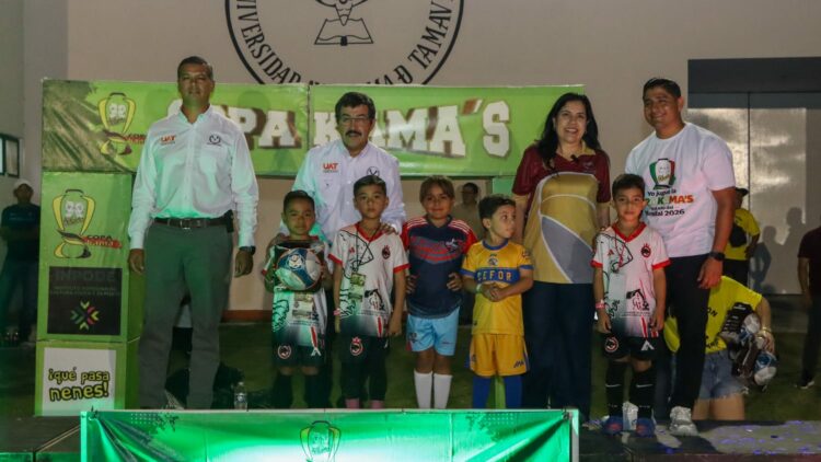 En el marco del fortalecimiento de la vinculación social y el impulso a la formación integral de la niñez y juventud, el rector de la Universidad Autónoma de Tamaulipas (UAT), Dámaso Anaya Alvarado, inauguró la Copa Kama’s de futbol la noche de este viernes 17 de abril en las instalaciones del Gimnasio Multidisciplinario Mante, espacio universitario que fungió como sede del evento.