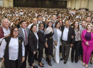 Ante miles de trabajadores del sector educativo de estado, la secretaria de Educación de Tamaulipas, Lucía Aimé Castillo...